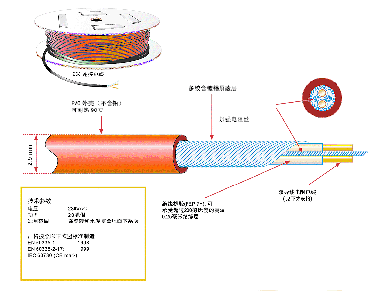 5.0±10%毫米直径的双导电地热线-新型发热电缆,可满足5毫米-100毫米不同覆盖厚度设计